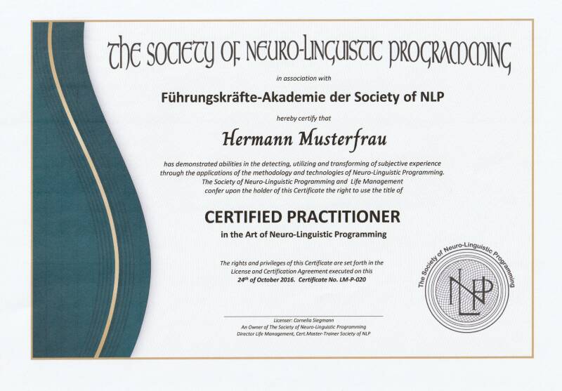 Die NLP Zertifikate der Society of NLP sind weltweit geschätzt. Sie sind ein Gütesiegel, das Ihre Kompetenzen in Kommunikation und Führung belegt und Ihre Karrierechancen verbessert.